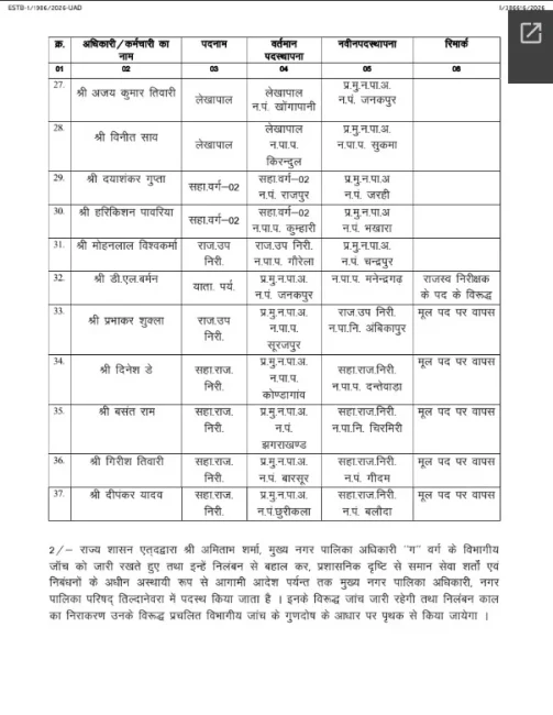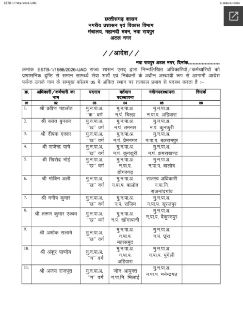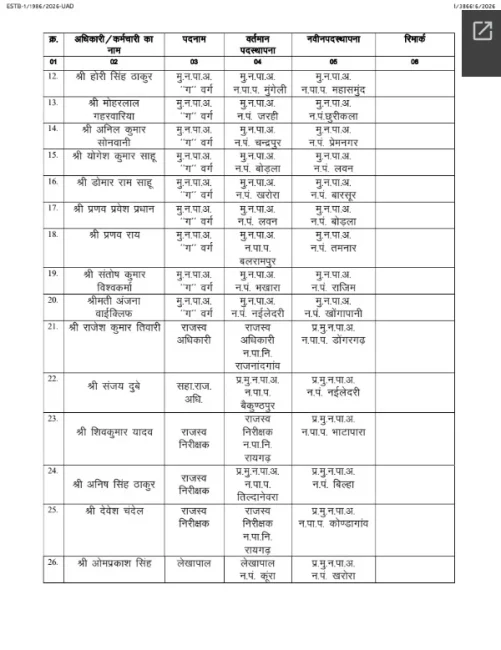 रायपुर: प्रदेश के नगरीय प्रशासन विभाग ने बड़े पैमाने पर मुख्य नगरपालिका अधिकारी, निकायों में पदस्थ लेखपाल और निरीक्षकों का तबादला आदेश जारी किया गया है।