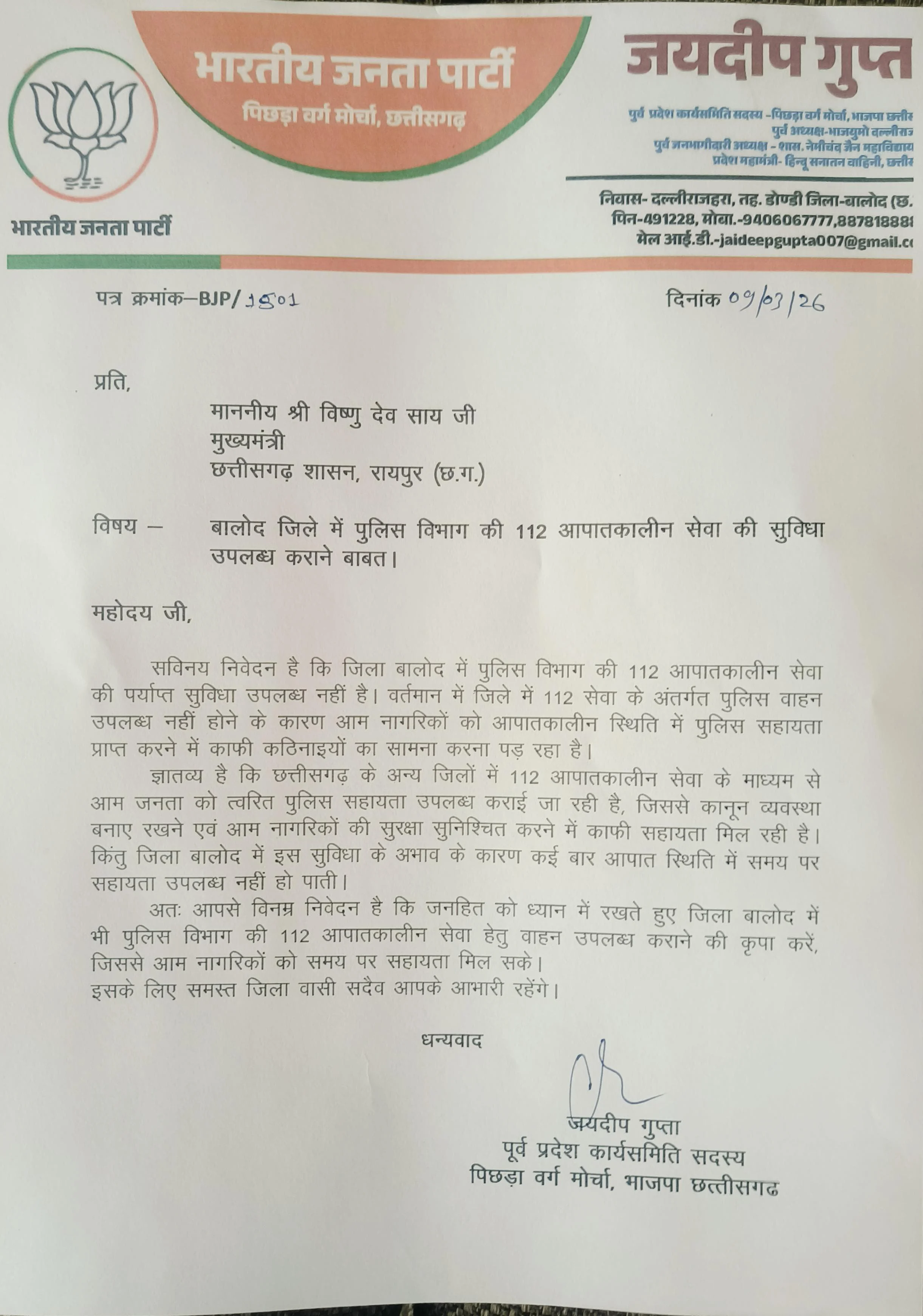 भाजपा नेता जयदीप गुप्ता द्वारा सौंपे गए ज्ञापन में बताया गया कि 112 आपातकालीन सेवा आम नागरिकों को त्वरित पुलिस सहायता प्रदान करने के लिए एक महत्वपूर्ण व्यवस्था है। छत्तीसगढ़ के अधिकांश जिलों में इस सेवा के अंतर्गत पुलिस वाहन उपलब्ध हैं, जिससे दुर्घटना, विवाद, अपराध अथवा अन्य आपातकालीन परिस्थितियों में लोगों को तुरंत पुलिस सहायता प्राप्त हो जाती है।