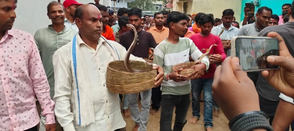 Chhattisgarh news:गरियाबंद जिले के फिंगेश्वर ब्लॉक के ग्राम देवरी में ऋषि पंचमी के अवसर पर परंपरागत रूप से जहरीले सर्पों की शोभायात्रा निकाली गई। इस अद्भुत आयोजन को देखने अंचल सहित दूर-दराज़ के गांवों से हजारों की भीड़ उमड़ पड़ी और पूरा गांव श्रद्धालुओं से खचाखच भर गया।