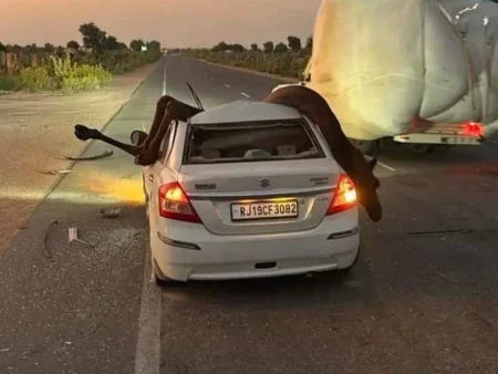 Rajasthan news:देचू-फलौदी सड़क मार्ग पर बुधवार सुबह एक स्विफ्ट कार और ऊंट के बीच टक्कर हो गई। टक्कर इतनी जबरदस्त थी कि ऊंट कार की छत तोड़कर अंदर बुरी तरह फंस गया। इस हादसे में कार चालक को मामूली चोटें आईं, जबकि ऊंट भी घायल हुआ।